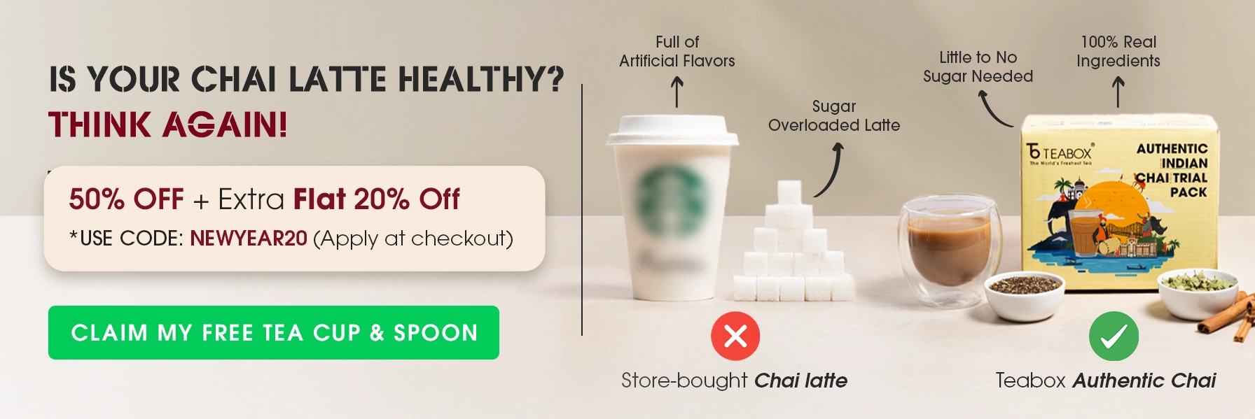 Absolutely! Our chai is crafted with high-quality tea leaves and real, whole spices—like cardamom, cinnamon, and cloves—that naturally enhance the flavor without the need for excessive sugar. Unlike chai lattes, which rely on syrups and artificial sweeteners, Teabox chai is bold and flavorful on its own. You can enjoy it unsweetened or adjust it to your preference with minimal sugar.